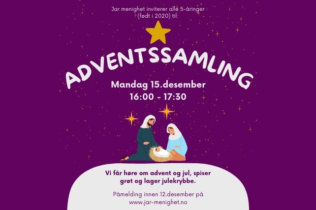 Mandag 15.desember kl. 16:00-17:30 ønsker vi alle 5-åringer m/voksen velkommen til adventssamling i Jar kirke. Les mer og meld deg på her!